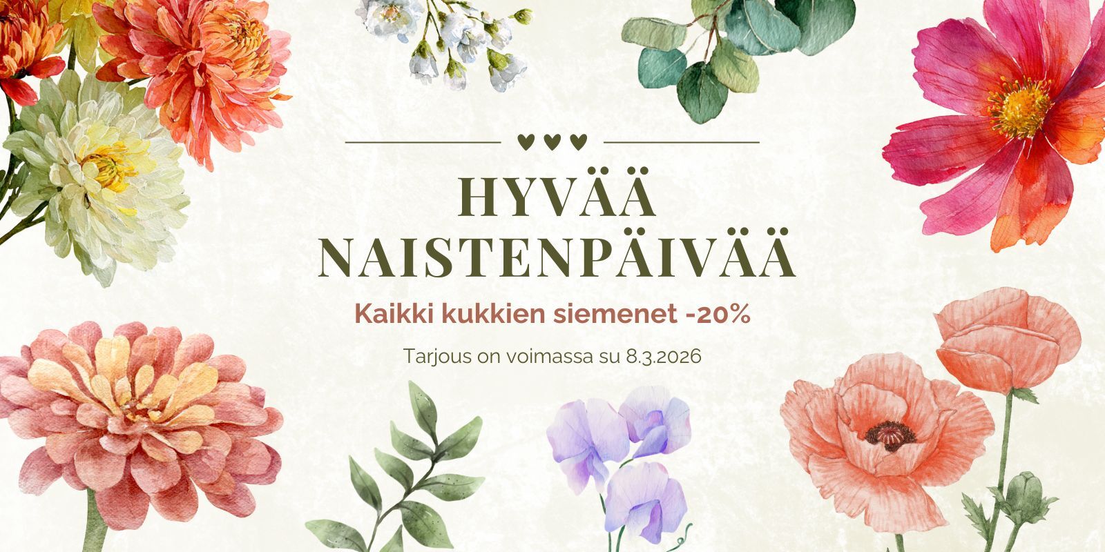 Naistenpäivän kunniaksi kaikki kukkien siemenet −20 % sunnuntaina 8.3.