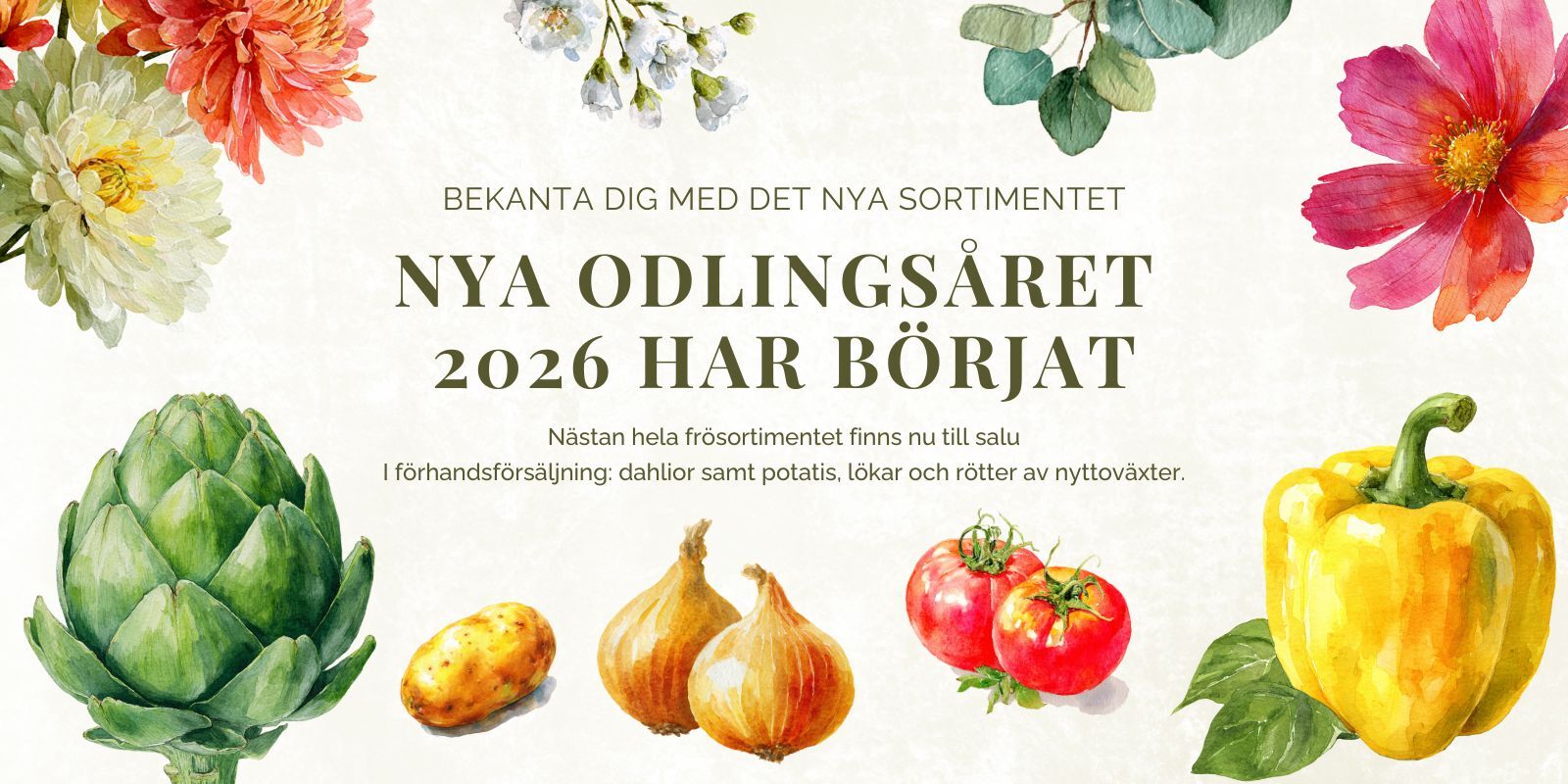 Det efterlängtade ögonblicket för trädgårdsentusiaster har äntligen kommit – de första produkterna för säsongen 2026 finns nu till salu. Nästan hela det nya frösortimentet är tillgängligt, med många spännande nyheter. Samtidigt har förhandsförsäljningen av dahlior, sättpotatis, sättlök och knölar av nyttoväxter inletts.